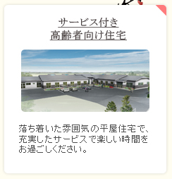 また、サービス付きの高齢者住宅では、新築で清潔な施設での充実した介護サービスをご提供いたします。個々のプライバシーは確保されており、トイレも各居室に完備しております。入居者様同士のコミュニケーションも取りやすいスペースも広く、リハビリの施設も最新のものを揃えています。平屋の建物は良くあるマンション型の介護施設と違いどこか懐かしく柔らかい印象。新築でありながら落ち着いた暮らしやすい雰囲気の住居となっています。
